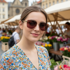 Sluneční brýle už nejsou jen praktickou ochranou očí před sluncem. Dnes jsou neodmyslitelnou součástí každého stylového outfitu a výrazným módním doplňkem, který dokáže podtrhnout osobnost a individualitu. Fashion brýlový model, který sleduje aktuální módní trendy. Převládajícím materiálem brýlového rámu je kov, který působí vždy elegantně a minimalisticky. Sluneční brýle mají UV filtr 400, a to znamená, že blokují veškeré UV záření s vlnovou délkou do 400 nanometrů. To zahrnuje jak UVA, tak UVB záření. Tento UV filtr je nezbytnou součástí kvalitních slunečních brýlí. Jeho přítomnost zajišťuje komplexní ochranu očí před škodlivým UV zářením a přispívá k dlouhodobému zdraví očí. Brýle propouští 8 - 18 % světelných paprsků a brýlové čočky mají tmavé zbarvení. Intenzita ztmavení brýlových čoček je vhodná jako ochrana před silným slunečním záření.Díky virtuálnímu zrcadlu si můžete tento brýlový model okamžitě vyzkoušet přímo z pohodlí domova. Brýle přijdou v originálním pouzdře nebo sáčku od výrobce. Příjemným doplňkem brýlí je i čisticí hadřík z mikrovlákna vhodný k péči o brýlové čočky.